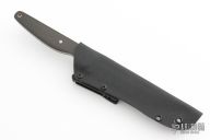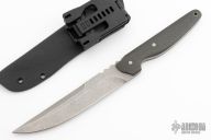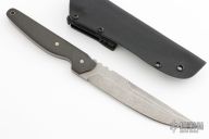 This Kwaiken by Peter Rassenti features a stonewashed blade with notched thumbrest and false top edge, .213" blade stock and 1.178" blade depth, full tang construction. The handle has carbon fiber scales with red liners. Comes with a kydex sheath. Has some sheath marks, otherwise excellent condition.