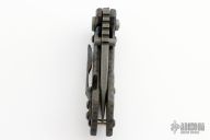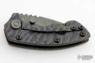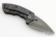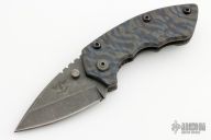 This linerlock folder by James Coogler features a dark tumble finished blade with dual thumbstuds and a notched thumbrest. The handle has a flamed titanium frame with matching titanium clip, tip up carry. Smooth action. Nice blade seating, detent and lockup. Excellent condition.