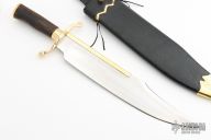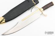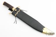 This Musso Bowie made by Kingdom of Arms features a hand hammered 5160 carbon steel blade as the originals were made, full tang, heat treated and tempered as the originals, with a sharp convex edge. The back strap, guard and pommel butt are brass with a hardwood grip. The included scabbard is leather over wood with brass strap and chape and a leather hanger.