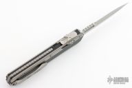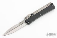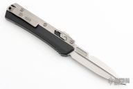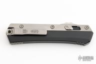 This Glykon by Microtech features a stonewashed double edged blade with fullers and notched thumbrest. The handle has a black aluminum chassis with bead blasted titanium overlays and tip down clip. Comes with original box and papers. Excellent condition. Dated 04/2023 and #830