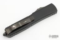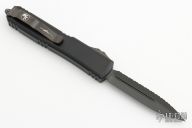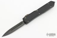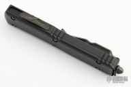 This Ultratech OTF automatic features a D/E black blade with full serrations. The handled features a black aluminum frame with a bead blasted stainless steel clip. Glass breaker. Serial number 377 and dated 03/2023. Includes the original box and papers. Excellent condition.
