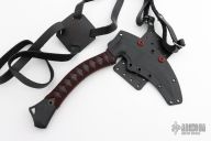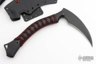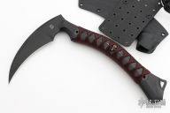The ReaperTAC from Bastinelli Creations is one cool tool. It's a tactical version of a scythe, an old school tool for reaping crops that has long since been replaced by heavy machinery throughout much of the world. This variation is like a tomahawk in its tactical usage however it incorporates none of its utility functionality. The ReaperTAC measures 9.45" overall with a 6.7" Bohler N690Co stainless steel blade. The recurved shape allows this blade to rip and tear like an elongated talon and the design tapers toward the tip to allow ample penetration power from such a unique tool. The ergonomic handle is made from contoured black G10 with cord wrap and menuki. The ReaperTAC includes a kydex and leather shoulder sheath.  Comes with zippered case.  New from maker!