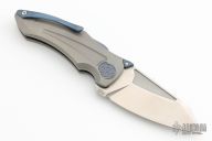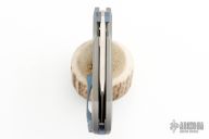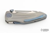 Our goal was to lighten this beast while keeping it amazingly strong, so we 3D-machined it inside and out.  This is our first button lock flipper! (And what a challenge it was to pull off!)  And finally, we added a little “bling” by anodizing the thumb studs, pocket clip, and backspacer either Bronze or Blue – very subtle and muted colors that set off the look of the knife in a way we haven’t tried before!