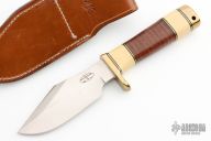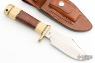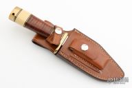 This Mountaineer by Ed Martin Knives features a satin finish blade with a sharpened top edge and notched thumbrest, .217" blade thickness and 1.687" blade depth, hidden tang construction. The handle has a brass guard and butt, stacked leather and ivory paper micarta grip with black/brass spacers. Very nice look and feel. Dated 07 on choil and sheath. comes with original brown leather sheath. Excellent condition.