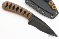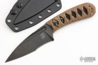 This SIN by Bastinelli Knives features a black finish recurve blade with notched thumbrest and fullers, .136" blade stock and 1.15" blade depth, full tang construction. The handle has a custom tan cord wrap a bronzed menuki. Comes with kydex sheath and zippered case. New from maker!