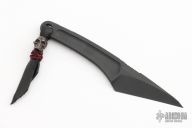 This Kiridashi from Bastinelli Knives features a black finished chisel ground blade with swedge and notched thumb rest. The handle has a full tang construction. Exposed tang with lanyard hole and lanyard on pommel. Includes kydex neck sheath and padded and hard case. New from Maker!
