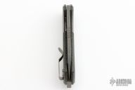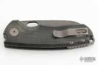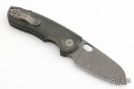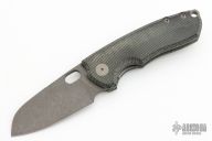 This F5.5 by Urban EDC Supply is a Vox Design. It features a dark tumble finished blade with thumbhole and notched thumbrest. The handle has black micarta scales, blasted titanium liner, backspacer and tip up clip. Rides on bearings, nice detent, lockup and blade seating. Comes with original box and zippered case. Excellent condition.