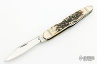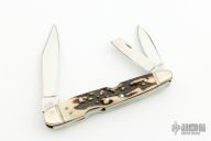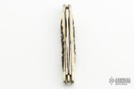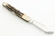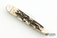 This Lockback Whittler by William Stoddart features mirror polished blades with nail nicks. The handle has fluted nickel silver bolsters, stag covers, brass liners, stainless steel springs. Has some light scratches, otherwise good condition. Comes with a zippered case.