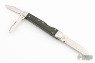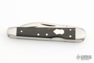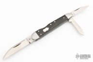 This Case/Bose yearly knife (2014) features three satin finished blades with nail nicks, the main blade is a lockback, the two smaller blades are both slipjoints with halfstops. The handle has stainless steel bolsters and cap, ebony covers, stainless steel liners and back springs. Comes with a leather zippered case and original box and papers. Excellent condition.