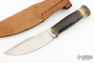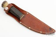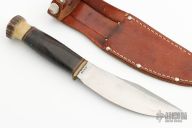 This Vintage Woodcraft by Marbles features a clip point blade with notched thumbrest, .164" blade stock, 1.245" blade depth, hidden tang construction. The handle has a brass guard, stacked leather grip, stag pommel, black/brass/red spacers. Includes a brown leather sheath. Has patina and scratches, has been used and sharpened, otherwise good condition for its age.
