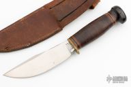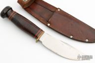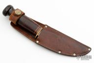 This Vintage Woodcraft by Marbles features a clip point blade with notched thumbrest, .151" blade stock, 1.245" blade depth, hidden tang construction. The handle has a brass guard, stacked leather grip, black pommel, black/brass/red spacers. Includes a brown leather sheath. Has patina and scratches, has a loose butt cap, otherwise good condition for its age.