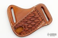 This cross draw sheath by A&M Leather is handcrafted from top quality leather, hand tooled. Has hole in the bottom of the sheath to push the knife out easier. Made primarily for slipjoints. Very well-made. New from maker.