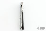Not to be outdone, the blade is paired with an equally stunning handle featuring polished, 3-D-machined G-10 scales that also feature longitudinal fullers. The handle’s full stainless steel liners provide impressive structural strength and form the foundation of the knife’s stout LinerLock mechanism. Its shape is reminiscent of the style of classic Swiss daggers, bracketing the hand at each end for a secure grip while offering a generous palm swell in the center. A pocket clip configured for right-side, tip-up carry completes the design, ensuring both ease of carry and immediate access.
