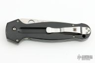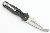The EuroEdge’s dramatic, near-symmetrical blade is precision machined from CPM® S30V® particle metallurgy stainless steel and features several fullers to reduce its weight and strengthen it. The bead-blasted fullers stand in contrast to the blade’s beautifully executed satin finish to further highlight their presence. The blade’s single cutting edge is balanced by a long swedge (unsharpened bevel) and Spyderco’s Trademark Round Hole™ for quick, positive, one-handed opening.