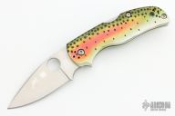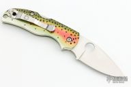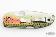 Abel Reels not only manufactures the world’s finest fishing tackle, they also embellish their products with a proprietary artistic process that transforms them into extraordinary, fully functional works of art. Spyderco is proud to collaborate with Abel Reels on a unique series of knives that showcases the exceptional talents of both companies. The foundation of these knives is a remarkable variation of the Native 5 that features an ultra-corrosion-resistant LC200N blade and a handle precision machined from aircraft-quality aluminum. Once Spyderco’s manufacturing processes are complete, the handle components are sent to Abel Reels’ team of artists who hand paint them with special chemical dyes to create photorealistic patterns of popular game fish. Their incredibly painstaking multi-stage anodizing process takes many hours and, because it is entirely done by hand, makes every pattern a one-of-a-kind work of art. Abel is the only company in the world capable of performing this proprietary process and Spyderco is honored to partner with them in creating these heirloom-quality knives.