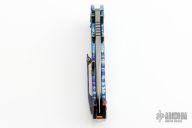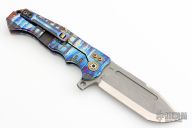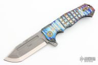 This ADV Tanto framelock flipper has a two-tone finished blade with swedge, fullers, notched thumbrest and flipper. Handle has an anodized titanium frame, anodized titanium backspacer, and tip up clip with roller, anodized hardware. Rides on bearings, nice smooth action, detent, lockup and blade seating. Comes with nylon zippered case. Excellent condition.