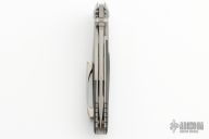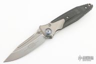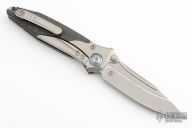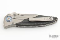 This Socom Bravo by Microtech is made in China by Rike Knife, it features a bead blasted blade, notched thumbrest, and dual thumbstuds. The handle has bead blasted titanium bolsters/liners, blue anodized pivot collars, carbon fiber scales. Tip up carry bead blasted titanium clip. Bead blasted titanium backspacer. Dated 02/2022 and s/n 0513. Excellent condition.