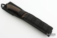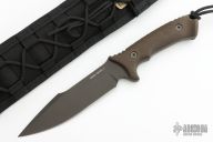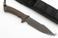 "SPARTAN HARSEY MODEL II - This knife is Spartan Blades third collaboration with world renowned knife maker, William "Bill" Harsey Jr. The Model II was produced with the combined goal of creating a sturdy knife that double as an excellent field and combat knife. The blade profile, Flat Grind, and top edge of this full tang knife work well on the battlefield and the backwoods alike. The ergonomic and textured canvas micarta handle is specifically designed to provide comfort and confidence of grip." This Harsey Model II features a CPM S35VN blade with Flat Black coating (SpartaCoat - PVD - DLC) and a brown canvas micarta handle. Includes black nylon MOLLE sheath. Comes with original box and sheath. Excellent condition.