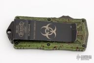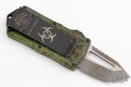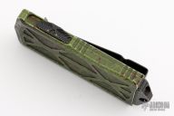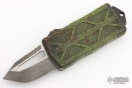 This Microtech Exocet features an apocalyptic finished tanto blade. The handle has a distressed green aluminum handle and a stainless clip that doubles as a money clip dated 10/2021 S/N 010. Excellent Condition.