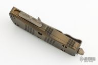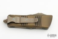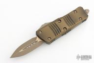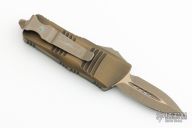 This Troodon Mini OTF automatic by Microtech knives features a bronze apocalyptic finished double edged blade, and a bronzed apocalyptic aluminum handle with bronze apocalyptic finished hardware, tip down clip, and glass breaker. S/N 137. Dated 08/2021. Excellent condition.