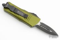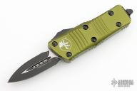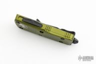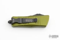 This Troodon Mini OTF automatic by Microtech knives features a black finished double edged blade, and an OD green aluminum handle with black hardware, tip down carry, thumbslide and glass breaker. S/N 3816. Dated 12/2021. Excellent condition.
