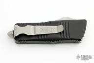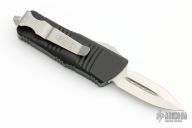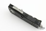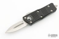 This Troodon Mini OTF automatic by Microtech knives features a stonewash finished double edged blade, and a black aluminum handle with bead blasted hardware, tip down carry. Glass breaker. S/N 2998. Dated 10/2021. Excellent condition.