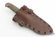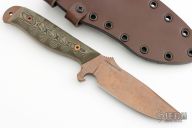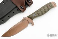 This Pathfinder by Dawson Knives features an Arizona Copper finished blade with notched thumb and finger rests, .219" blade stock and 1.290" blade depth, full tang construction with black/tan/green G-10 scales. Comes with a brown leather and kydex sheath, original box and COA. Excellent condition.