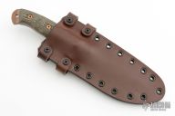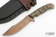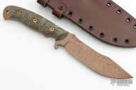 This Explorer Elite by Dawson Knives features an Arizona Copper finished blade with notched thumb and finger rests, .209" blade stock and 1.369" blade depth, full tang construction with black/tan/green G-10 scales. Comes with a brown leather and kydex sheath, original box and COA. Excellent condition.