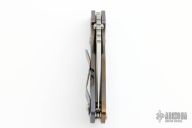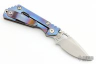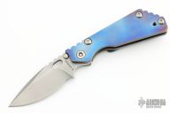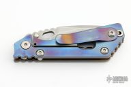 This PT by Mick Strider features a stonewashed blade with notched thumbrest and thumbhole. The handle has a blue anodized titanium frame with matching tip up clip. Excellent condition.