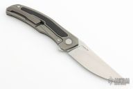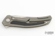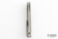 This Quantum Ursus by Shirogorov features a tumble finish blade with notched thumbrest and flipper. The handle has a blasted and milled titanium frame, G10 inlays, backspacer, tip up titanium clip with hidden screws. Rides on SRBS, nice detent, lockup and blade seating. Cromax PM blade steel. Excellent condition.