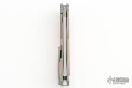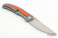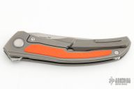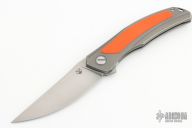 This Quantum Ursus by Shirogorov features a tumble finish blade with notched thumbrest and flipper. The handle has a blasted and milled titanium frame, orange G10 inlays, backspacer, tip up titanium clip with hidden screws. Rides on SRBS, nice detent, lockup and blade seating. Cromax PM blade steel. Comes with original box and COA. Excellent condition.