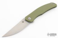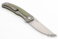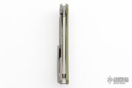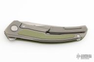 This Quantium Ursus by Shirogorov features a tumble finish blade with notched thumbrest and flipper. The handle has an OD G10 Scale, blasted and milled titanium frame, OD inlay and backspacer, tip up titanium clip with hidden screws. Rides on MRBS, nice detent, lockup and blade seating. Cromax PM blade steel. Comes with original box and COA. Excellent condition.
