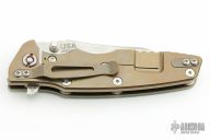 This Eklipse Flipper by Rick Hinderer Knives features a 3.5" stonewash finished blade, notched thumbrest and flipper, dual thumbstuds. The handle has a translucent green G-10 scale, and stonewashed bronze titanium handle/clip. Clip can be mounted for tip up or down carry. Nice lockup, seating, and detent. Comes with original box and extra hardware. New condition.