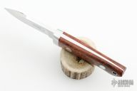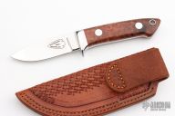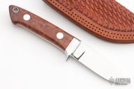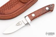 This Small Drop Point Hunter by Gary Martindale features amazing amboyna burl wood scales with red liners and a mirror polished stainless steel guard. Full tapered tang construction with .180" blade stock and .858" blade depth. Mirror polished blade. Includes a hand tooled brown leather sheath with belt loop. Brand new from maker at the 2023 Blade Show. #149 on blade. Gary's knives are incredible and this one is no exception.