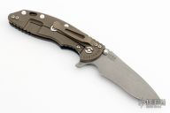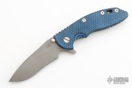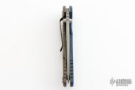 This XM-18 flipper from Rick Hinderer Knives features a 3.5" working finished blade, notched thumbrest and flipper, dual thumbstuds. The handle has a black/blue G-10 scale, and working finished titanium handle/clip. Clip can be mounted for tip up or down carry. Nice lockup, seating, and detent.  Comes with extra pivot washers. Excellent condition.