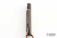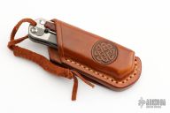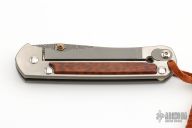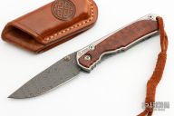 This Small Sebenza 2005 by Chris Reeve Knives features a Devin Thomas Stainless Ladder Damascus blade with dual anodized titanium thumbstuds and notched thumbrest. The handle has a two-tone titanium frame with snakewood inlays. Comes with original box, custom hand tooled brown leather belt sheath, original clip and screw, COA dated April 26, 2006, and original leather slip sheath. This knife comes with a Reeve filler tab installed inplace of the clip. This knife is in new condition, with the exception of two small dots on the lockbar from where the clip sat when it came new from the factory.