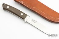 The 5" Utility by Bob Loveless features a mirror finished clip point blade with the "R.W. Loveless maker Riverside CA" Double Nude logo. Full tapered tang construction. .192" Blade Stock .970" Blade Depth. The handle has a stainless steel guard and green canvas micarta scales with red liners, lanyard hole. #85. Comes with matching numbered leather sheath. Has a couple of very light scratches, otherwise excellent condition.