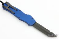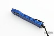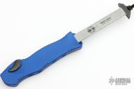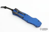 This Hydra by Heretic Knives (Anthony G. Marfione) features a DLC blade. The handle has a blue aluminum frame, stainless clip, stainless steel and carbon fiber charging handle. Comes with original box and papers. S/N 00553. Excellent condition.