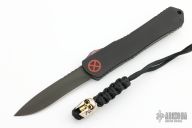 Predator Series Manticore-E with a deep engraved handle with a hand painted red X-men logo and Carbon Fiber back chassis. DLC Double Edge Blade, and DLC Hardware. Entropic Anodized clip and button.