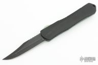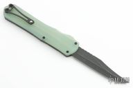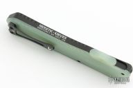 This Manticore-X by Heretic Knives features a battleworn black bowie blade with notched thumbrest. The handle has a black aluminum frame with jade G-10 back cover, black stainless steel hardware and battleworn black tip down clip, and jade G-10 thumbslide. Comes with original box, papers and sample tube of OTF Lube. Excellent condition. #02011