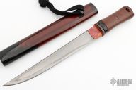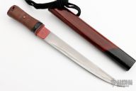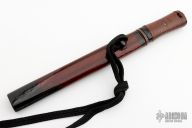 This Traditional Tanto by Kaji Customs features a hand rub satin finished blade with Hamon, .214" blade stock and 1.138" blade depth, hidden tang construction. The handle has a copper and Damascus fittings, kangaroo leather tsukaito. Comes with a charred Padauk wood saya. New from maker. The individual components of this knife are nice, but the fit up is a little loose.