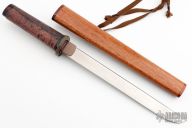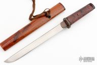 This Tanto by Kaji Customs features a hand rub satin finished blade with Hitatsura Hamon, .240" blade stock and 1.03" blade depth, hidden tang construction. The handle has a copper habiki, copper tsuba, ray skin grip with wood butt. Comes with wood saya. New from maker. The individual components of this knife are nice, but the fit up is a little loose.