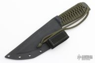 This Fighter from Mick Strider features a spear point blade with a nice deep swedge and false top edge, .217" with a blade depth of 1.805". This beast has a cord wrapped handle and a black kydex sheath. Excellent condition.