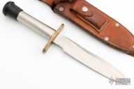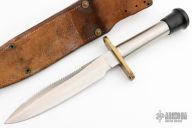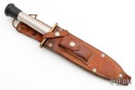This Solingen Randall Model 18-7.5 Crutch Tip by Randall Made has a blade with sawteeth, .207" blade stock and 1.272" blade depth, hidden tang construction. The handle has a brass guard, and stainless steel hollow handle, this knife has the original "Crutch Tip", there is no threaded butt cap, just a crutch tip covering the hollow handle. Comes with a brown leather sheath and original stone. Has some scratches and patina, otherwise excellent condition for its age. Comes with a Randall zippered case.