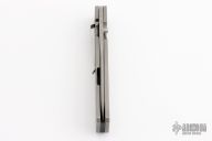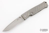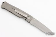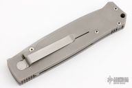 This Brend Collaboration - WB #2 Tactical D/A (#0221) is a collaboration between Walter Brend and Cutters Knife & Tool. This is the D/A version. Has a recurve bead blasted blade with false top edge and single thumbstud. The handle has a notched thumbrest on the bead blasted titanium frame, tip down clip. Smooth action with a nice detent, lockup and blade seating. Includes original box, papers and belt sheath. Has a couple light scuffs, otherwise excellent condition.