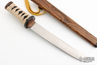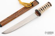 This Traditional Tanto by Kaji Customs features a hand rub satin finished blade with Hamon, blade forged from a Nicholson file, .185" blade stock and 1.273" blade depth, hidden tang construction. The handle has a copper habiki, black iron tsuba, leather wrap with a ray skin underwrap and a wood butt cap. Comes with a wood saya. New from maker. The individual components of this knife are nice, but the fit up is a little loose.