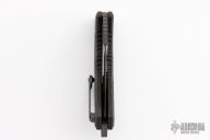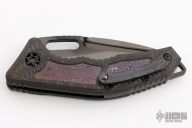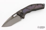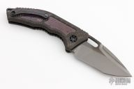 This Medusa Auto by Heretic Knives features a hand ground stealph polished blade with false top edge, notched thumbrest and thumbhole. The handle has a carbon fiber frame with Vegas Forge blued Damascus inlays, black hardware, backspacer and a tip up stainless steel clip with ceramic ball, lightning strike carbon fiber inlaid push button. Comes with original box, papers and zippered case. S/N 005.  Excellent Condition.