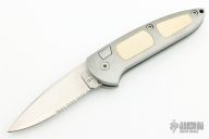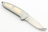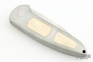 This Boker Top Lock auto features a satin finished blade with swedge. Aluminum frame with white inserts and a tip up stainless steel clip. Comes with original belt sheath. Has some light scratches, otherwise good condition.