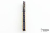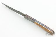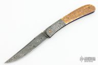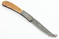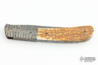 This sole authorship liner lock folding knife by Master Smith Don Hanson III features a 480 Layer Damascus blade (1095/15N20/1065), with a single gold thumbstud. The handle "Zig-Zag" Mosaic Damascus bolsters, premium crackle bark mammoth ivory scales, fileworked and anodized titanium liners, Damascus backspacer. Nice detent, lockup and blade seating. Excellent condition. Comes with a velcro case and COA. All Damascus is sole-authorship.
