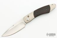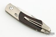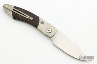 This B12 Auto by William Henry Fine Knives features a hand rub satin finished blade with false top edge. The handle has a satin finished titanium frame with desert ironwood burl inlays, tip up clip. Has safety. Nice action, lockup and blade seating. Has scuffs and scratches, has been used and carried, otherwise good condition. Comes with a zippered case.
